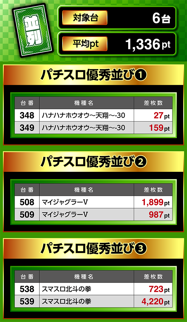 538番台と539番台の「スマスロ北斗の拳」が並んでプラスとなり、539番台は4,200ptを超えた。