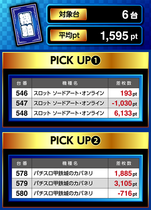 3台設置の「スロット ソードアート・オンライン」は2台がプラスを記録し、548番台は6,100ptオーバー。
