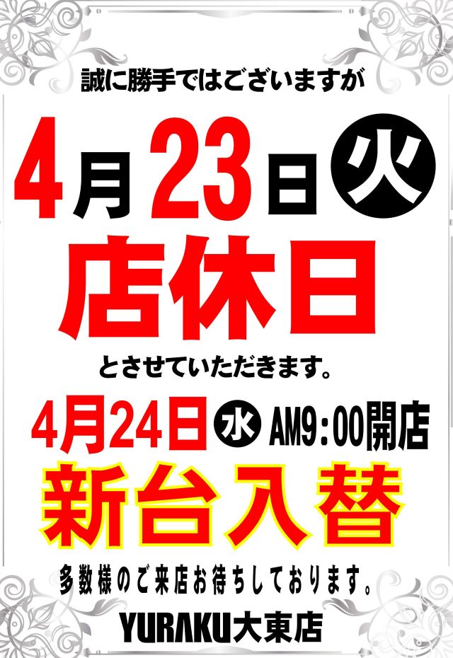 【有楽大東店】明日新台入替 朝9時開店!