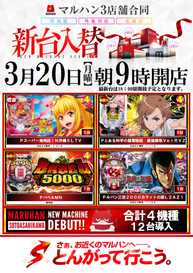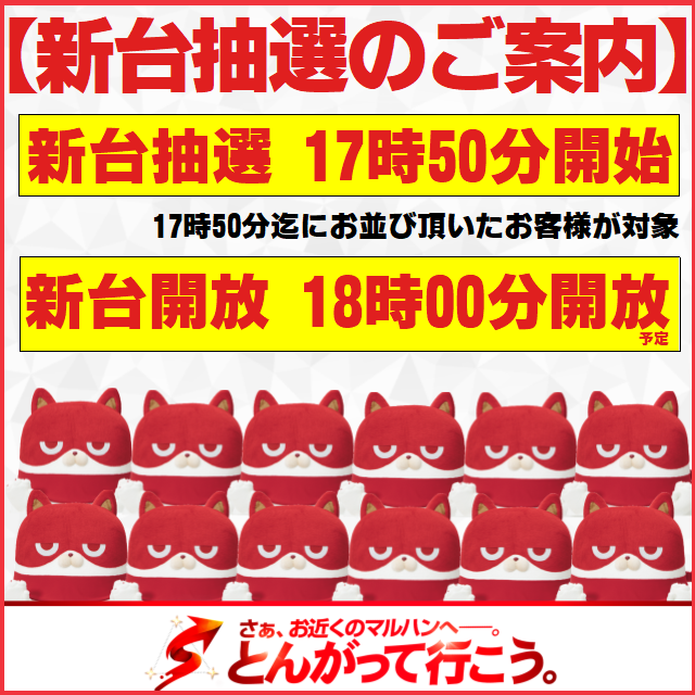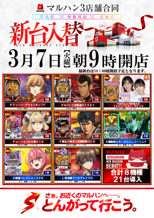 本日3月7日(火)新台入替(予定)マルハンにおまかせ!!