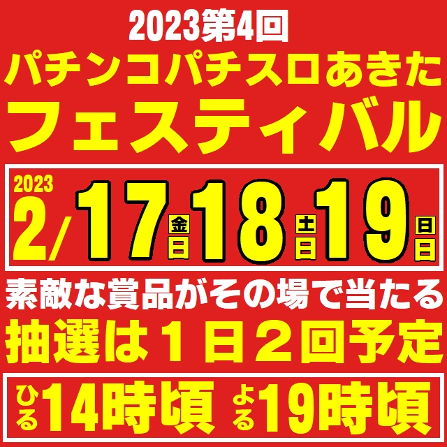 ★☆★☆★☆★☆★☆★☆★パチンコ・パチスロあきたフェスティバル17日18日19日1日2回抽選ひる14時頃 よる19時頃