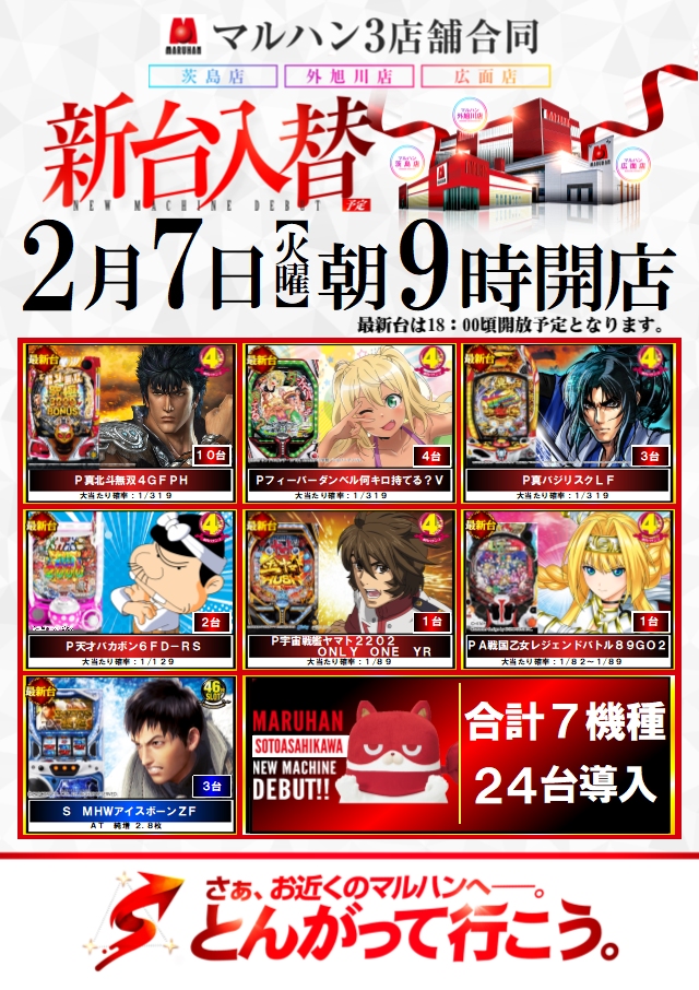 本日2月7日(火)マルハンにおまかせ!!新台入替(予定)