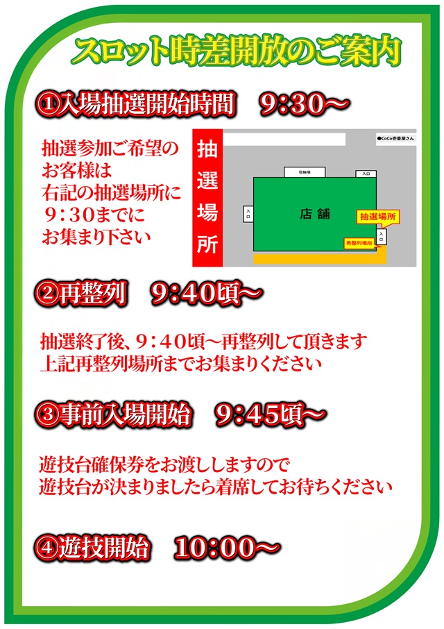 開店30分前の時点で並び順が9名以下の場合は並び順での入場とさせて頂きます。開店入場時に物を置いての場所取りはお断りしています。 |