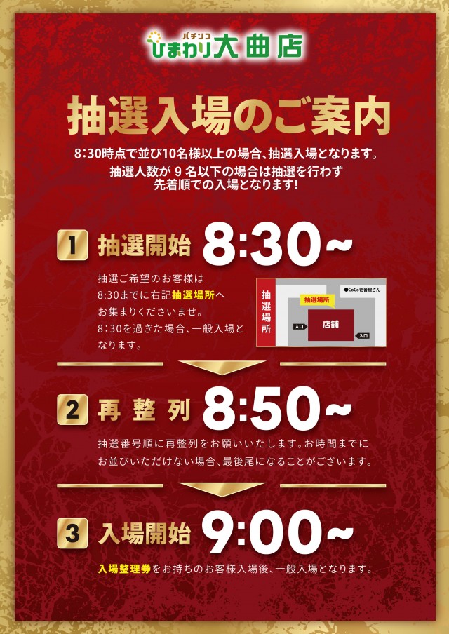 開店30分前の時点で並び順が9名以下の場合は並び順での入場とさせて頂きます。開店入場時に物を置いての場所取りはお断りしています。 |