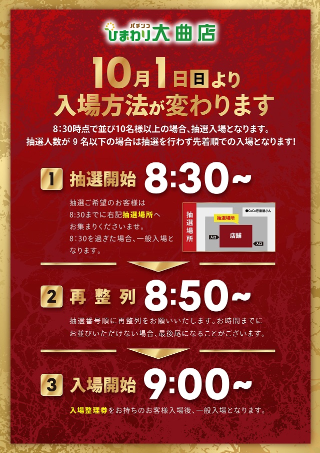 開店30分前の時点で並び順が9名以下の場合は並び順での入場とさせて頂きます。開店入場時に物を置いての場所取りはお断りしています。 |