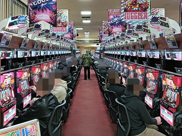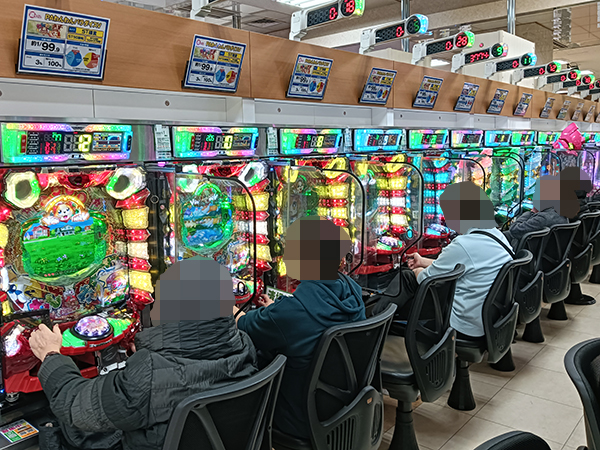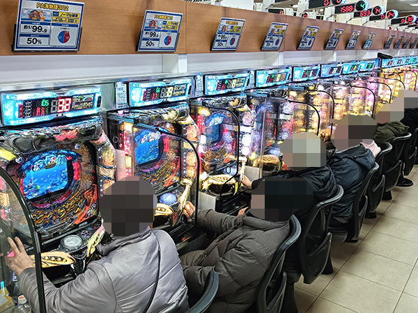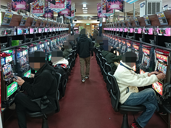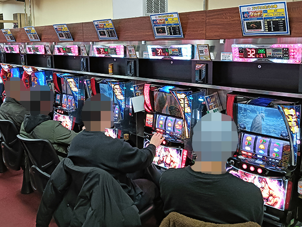 取材時は多くのプレイヤーが来店。パチンコ・パチスロともに、様々な機種が支持を得ていた。