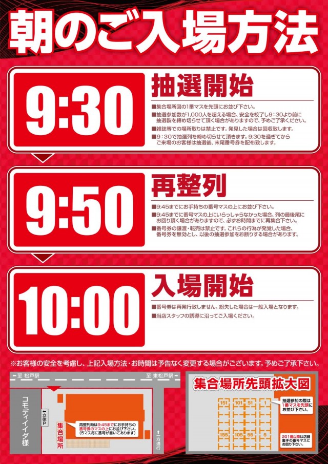 朝9:30までにお並びのお客様を対象に入場順番を決める抽選を実施。また、抽選途中でも再整列になる事がございます。 |