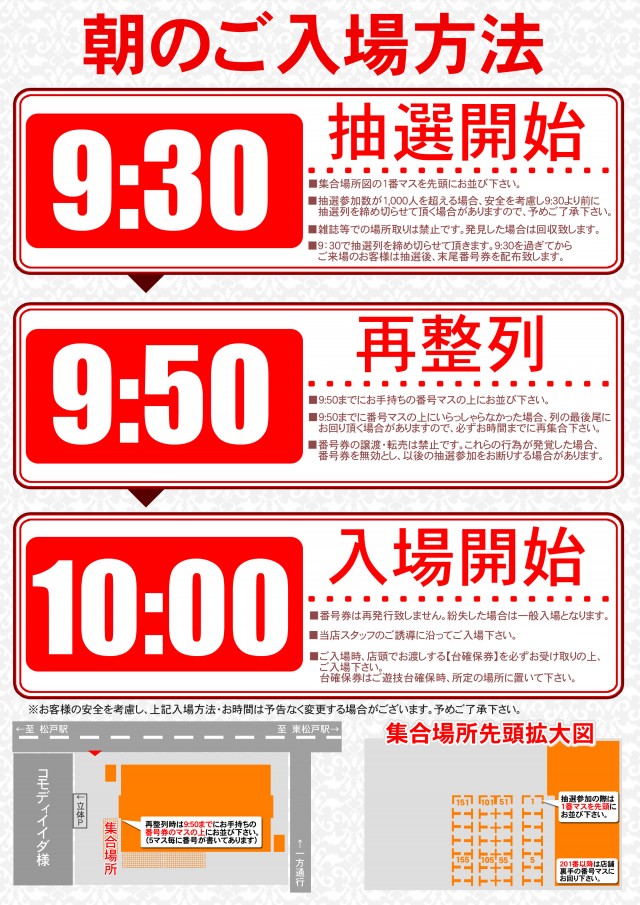 朝9:30までにお並びのお客様を対象に入場順番を決める抽選を実施。また、抽選途中でも再整列になる事がございます。 |
