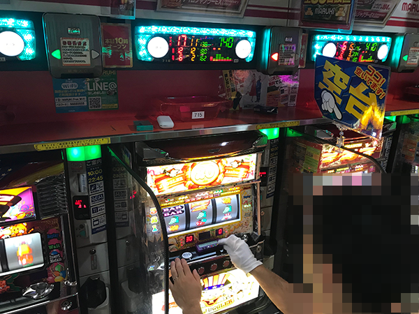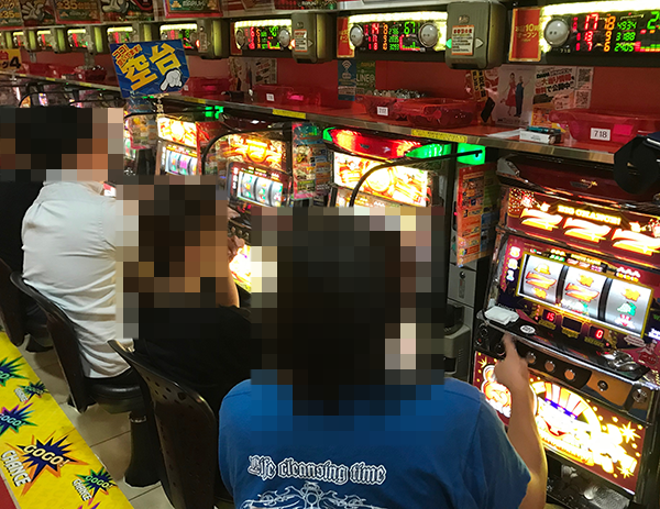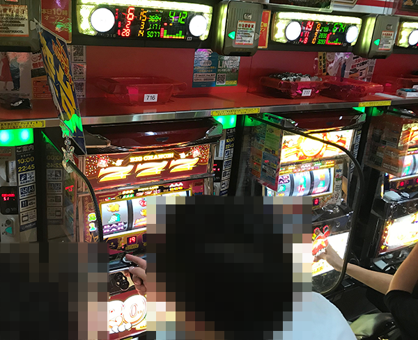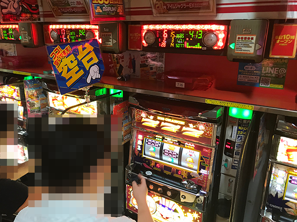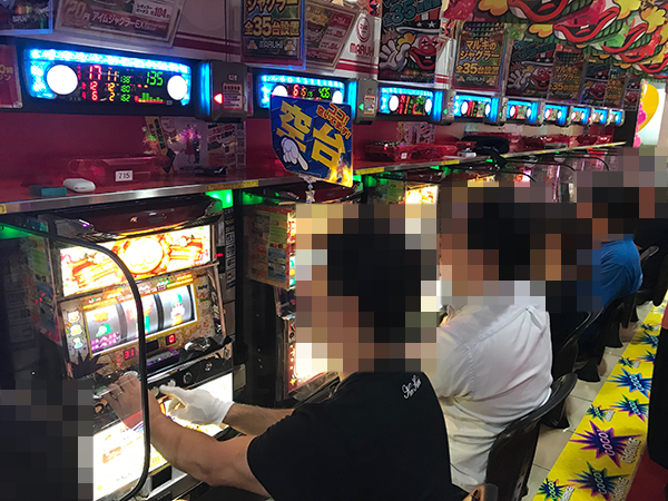 パチスロコーナーをみていくと、ジャグラーシリーズが設置されている場所からにぎやかな雰囲気が伝わってきた。シマ全体の稼働率が高いなかで、とくにうれしそうなプレイヤーが多かったのは「アイムジャグラーEX AnniversaryEdition」だ。