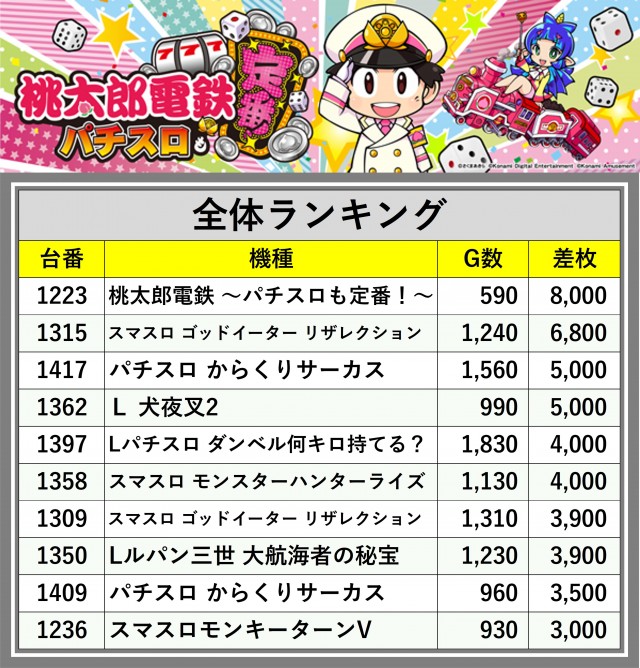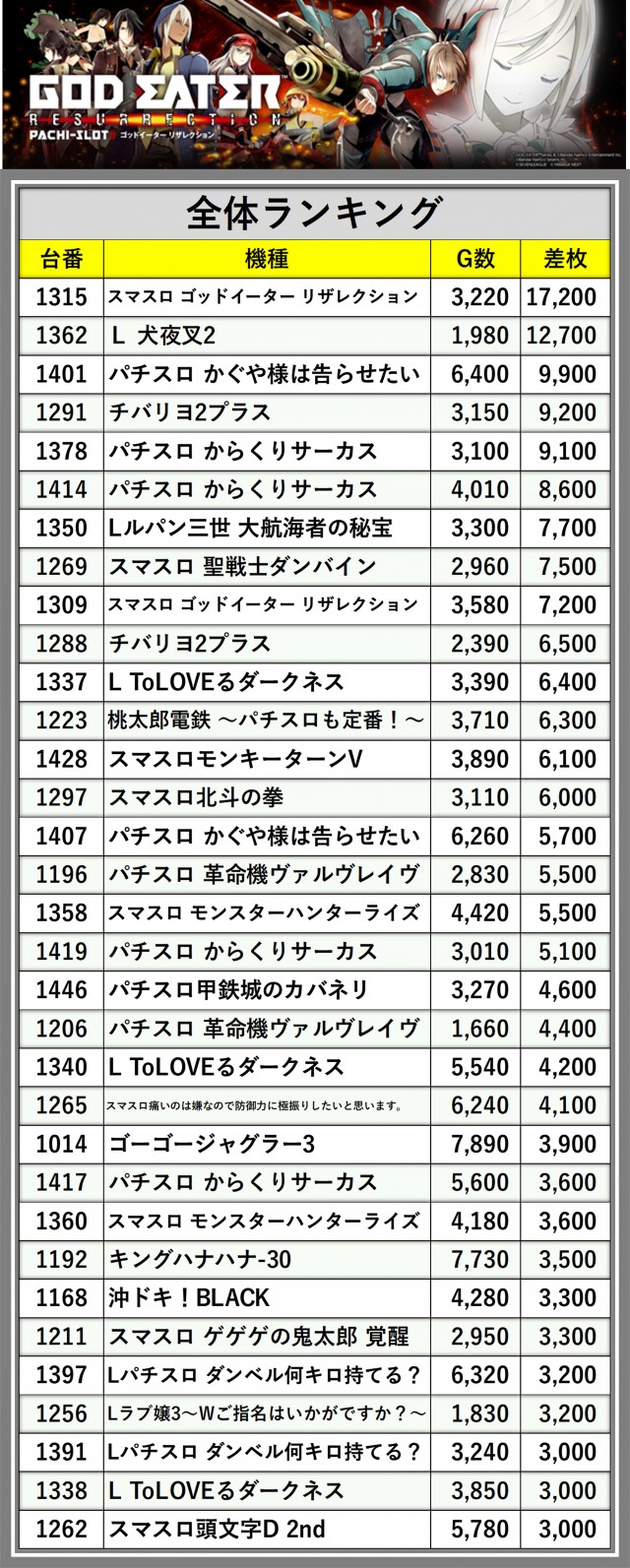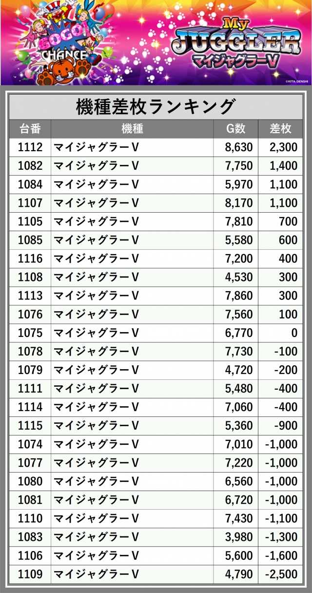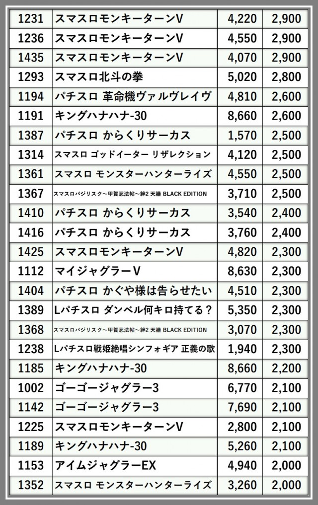 ※差枚数順に掲載しています