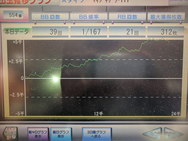今回のアッパーは、554番台の【マイジャグラーⅢ】にあらわれた…