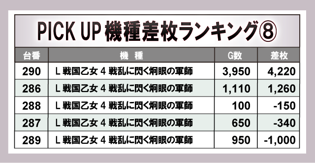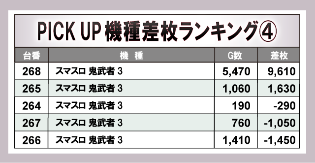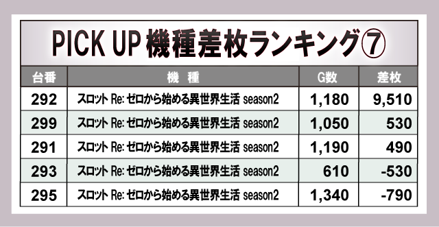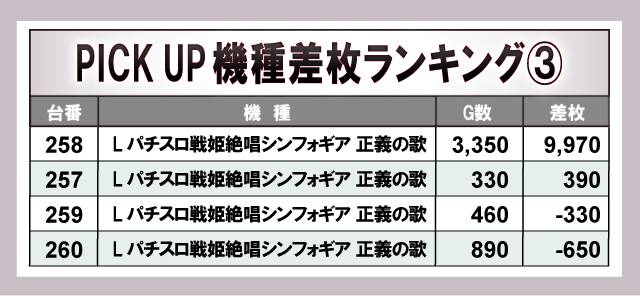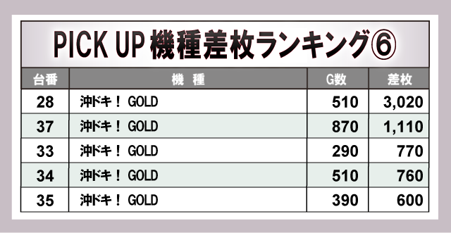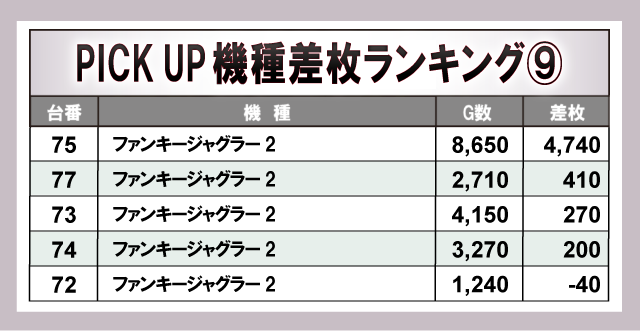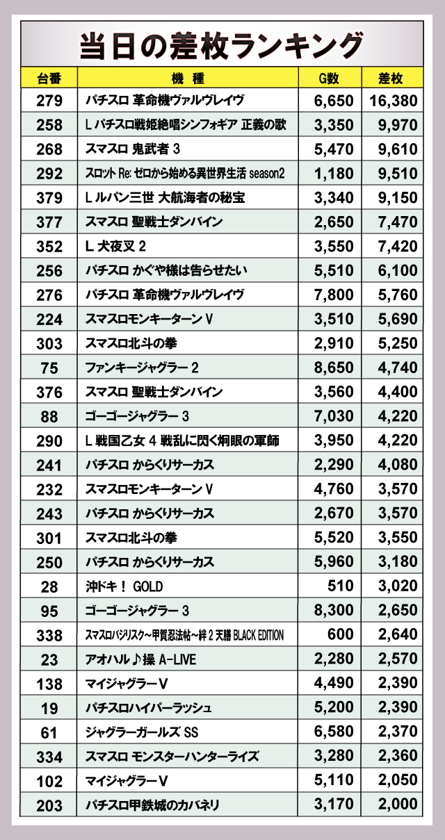 『ゴーゴージャグラー3』は高い回転数を記録しており、コンスタントなボーナス当選が窺える内容だ。また『スマスロ 聖戦士ダンバイン』は全台プラス差枚数をマークし、優秀機種として活躍を披露。今後も要注目エリアなのは間違いないだろう。