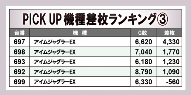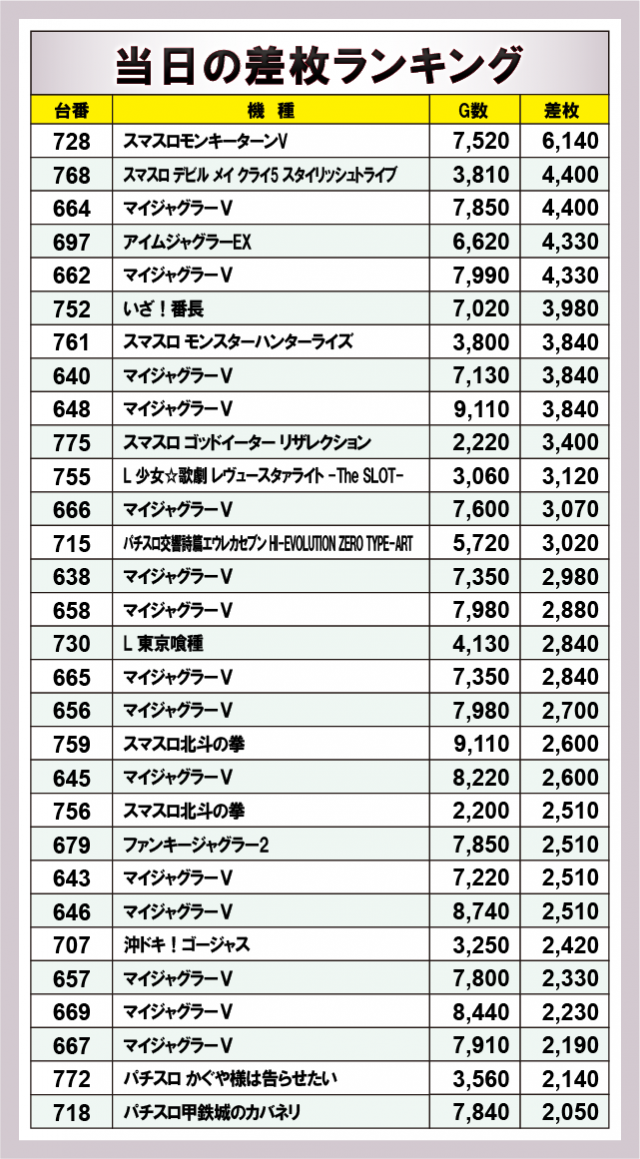 AT機に負けず劣らず『マイジャグラーⅤ』から好調台が多数発生し、遊技していたファンは手応えを感じながら恍惚の表情を浮かべていた!ほかにも『スマスロモンキーターンV』で+6,140枚と大台突破を記録、『アイムジャグラーEX』『パチスロ交響詩篇エウレカセブン HI-EVOLUTION ZERO TYPE-ART』『沖ドキ!ゴージャス』などのメダル機がランクインし、幅広い機種が可能性を秘めていた。