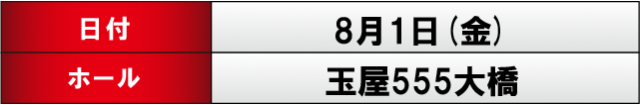 8月1日、『玉屋555大橋』にて「玉屋魂取材」が全店合同実施された。グループ創業月間のはじまりとなるこの日、足を運んだファンは大きな期待に胸を膨らませるなか、同店はやや緊張の様子を覗かせていたのも見逃せない。店内にてどのような盛り上がりが展開されたのか…さっそく以下から、出玉詳細データとともに当日の様子に迫っていこう!