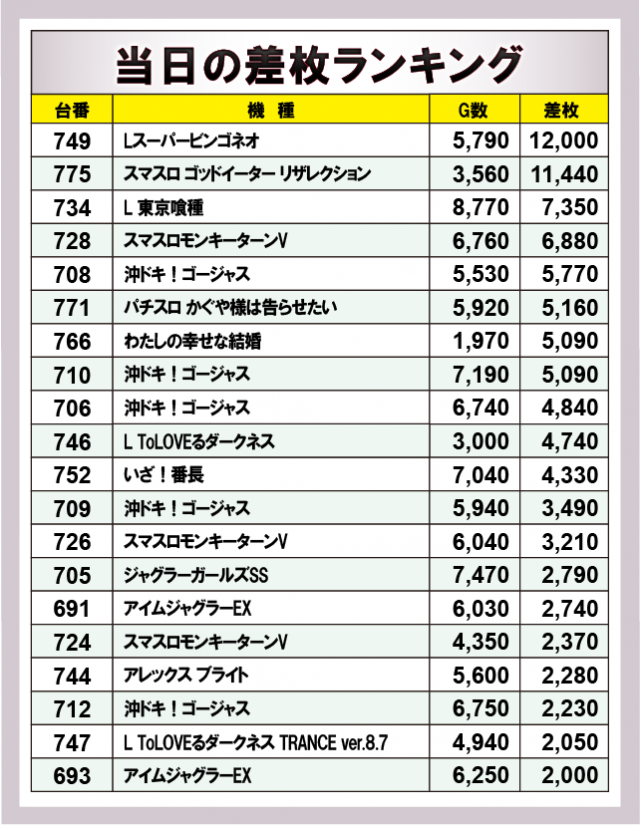 まずは「玉屋555大橋」全体差枚ランキングの発表だ!
