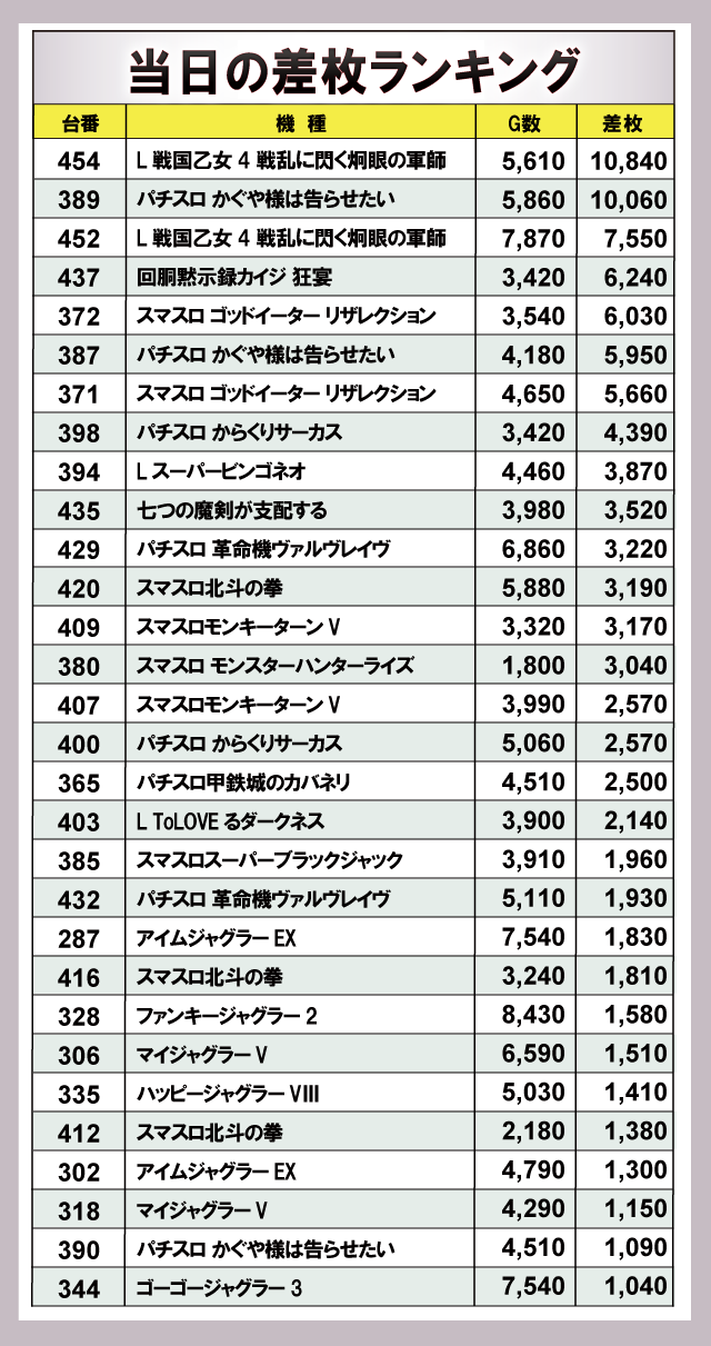 ※差枚数順に掲載しています。