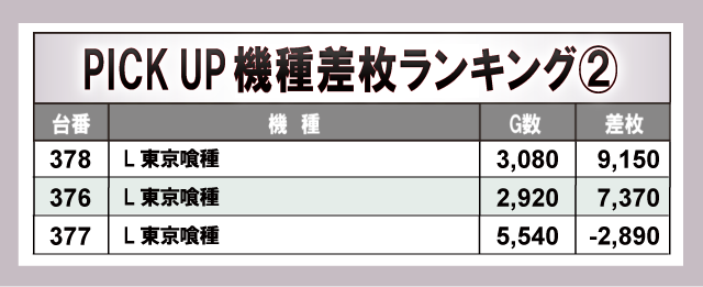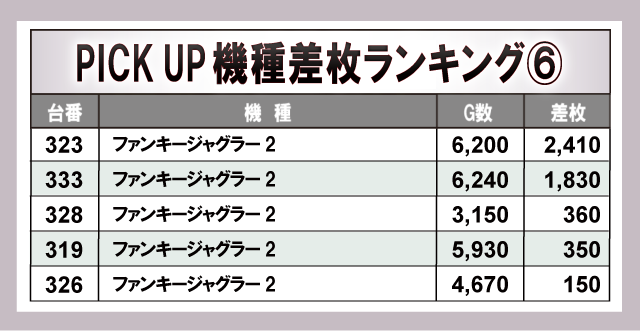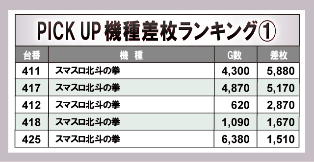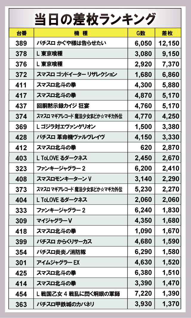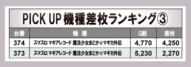 上表の6機種が優秀機種として活躍しており、そのいずれもがコンスタントな大当りを披露していたようだ。『スマスロ北斗の拳』は中でも安定した結果を残しており、新台『スマスロ マギアレコード 魔法少女まどか☆マギカ外伝』や『L ToLOVEるダークネス』は全台プラス差枚数をマークしている。店内全体が活気にも満ちていたことから、しっかりと期待に応えていたと言えるだろう。