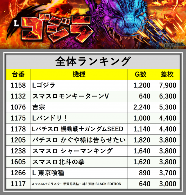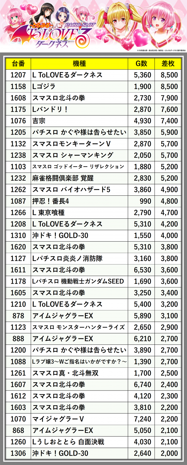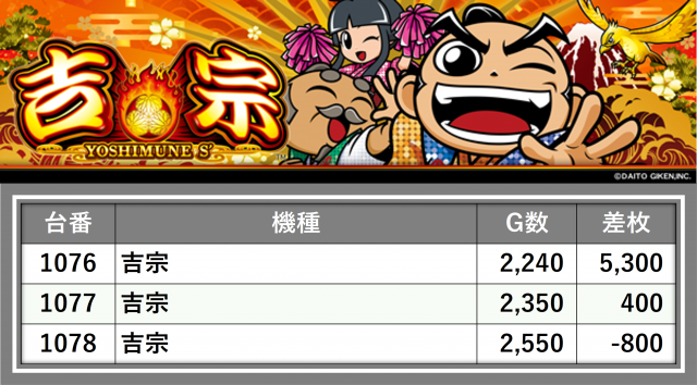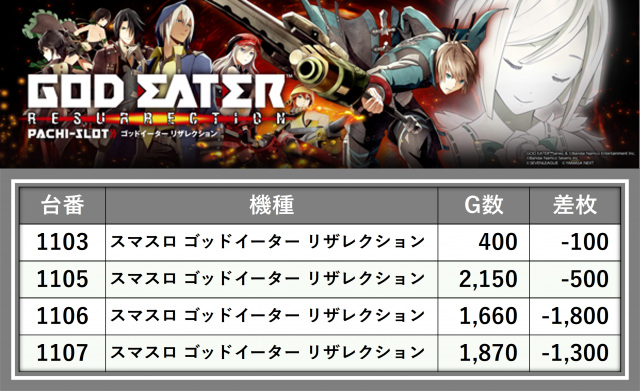 厳選された取材対象機種をはじめ、その他スロット全体から好記録が飛び出した!プレイヤーが楽しんだ1日を下記データにて振り返ってみて欲しい。