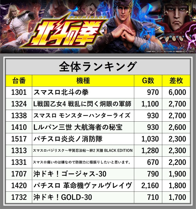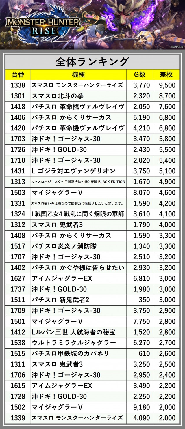 厳選された取材対象機種をはじめ、その他スロット全体から好記録が飛び出した!プレイヤーが楽しんだ1日を下記データにて振り返ってみて欲しい。