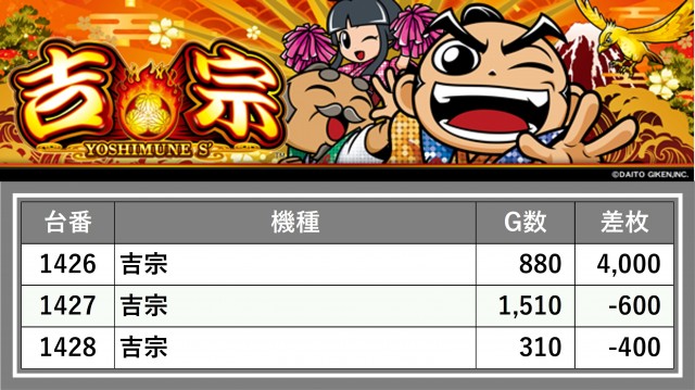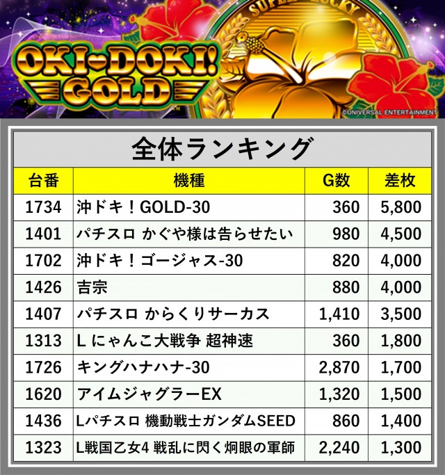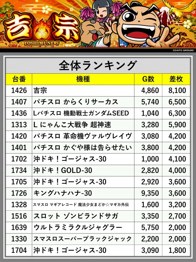 厳選された取材対象機種をはじめ、その他スロット全体から好記録が飛び出した!プレイヤーが楽しんだ1日を下記データにて振り返ってみて欲しい。