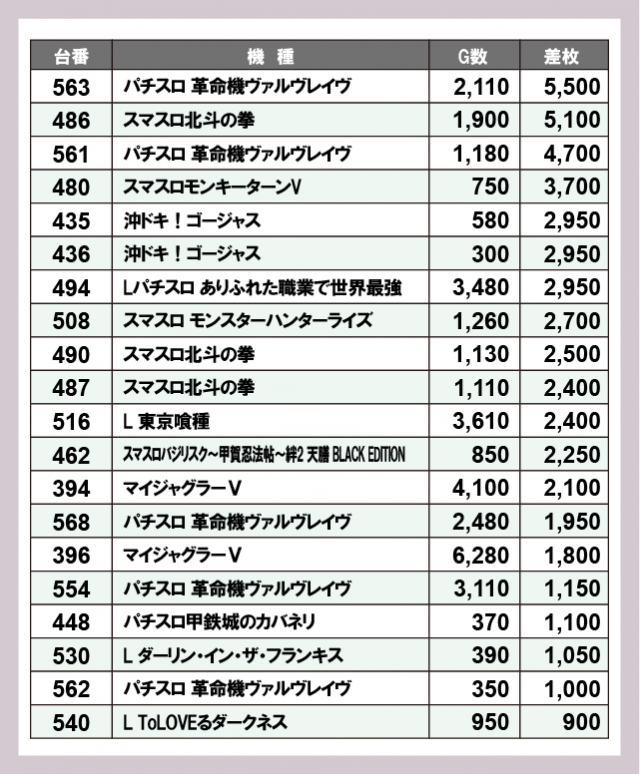 機種別差枚ランキング