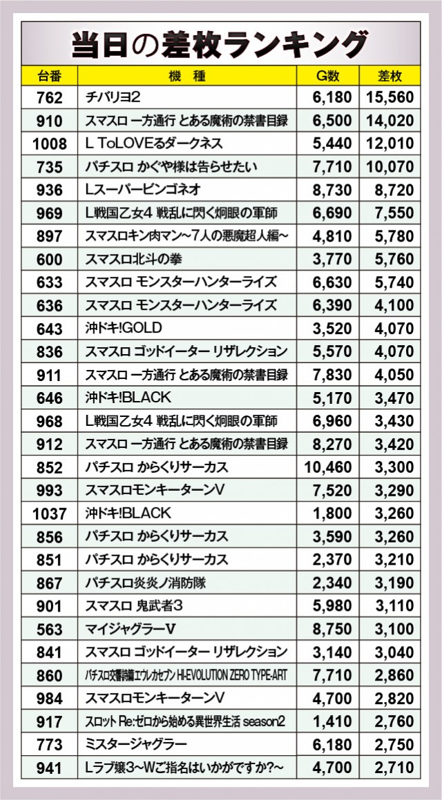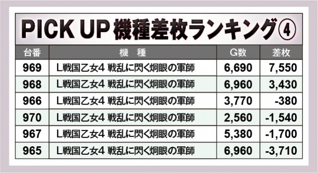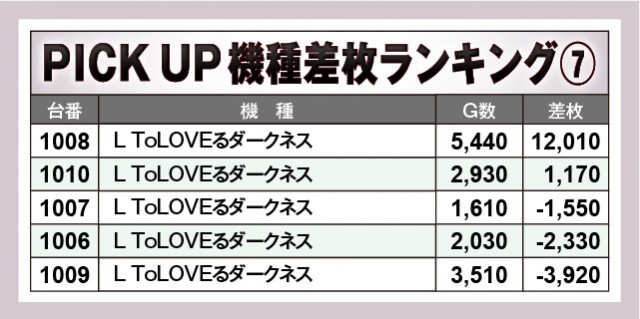 『L戦国乙女4 戦乱に閃く炯眼の軍師』『L ToLOVEるダークネス』にて突出した熱気を確認でき、遊技していたファン可能性を感じ取っていたに違いない。特に後者は万枚OVERという盛り上がりが見られ、満足度が高い1日を過ごしていた。また『L主役は銭形4』は全台マイナスとなっているが、それでもポテンシャルを秘めていたのは確かである。『Lバンドリ!』も同様により多くの回転数が積み重ねられれば、大きな熱気を放っていたことだろう。