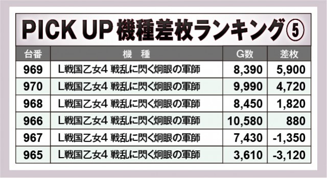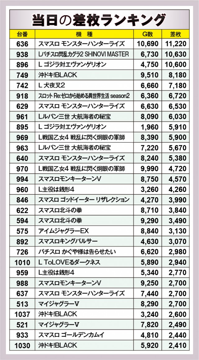 『L ゴジラ対エヴァンゲリオン』の万枚OVERが目立ち、さらに『L主役は銭形4』『Lルパン三世 大航海者の秘宝』でもまとまった出玉が確保されるなど、優秀機種から放たれた熱気が鮮烈であるばかり。特に『L戦国乙女4 戦乱に閃く炯眼の軍師』は活気と熱気の中心と言っても過言ではなく、遊技していたファンは満足度が高い1日を過ごしていた。『Lバンドリ!』も可能性を秘めていたものの、振るわない結果となってしまったが、次回以降のリベンジに期待したいところだ。