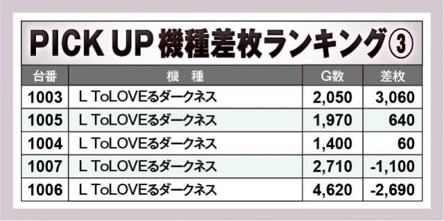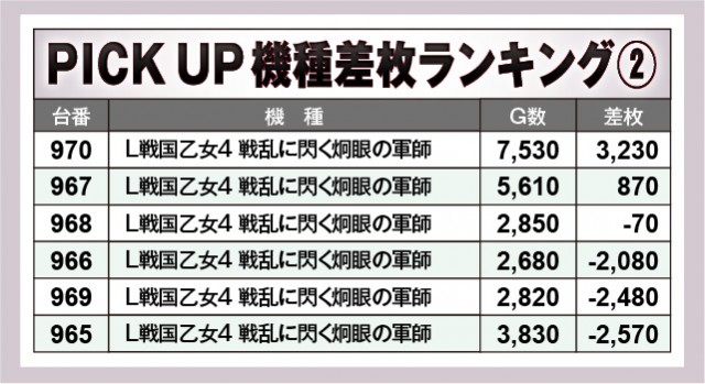 『L パチスロ シン・エヴァンゲリオン』は大きなポテンシャルを秘めながらも、4,000枚OVERと気を吐く結果のみとなっている。終日を通して打ち込まれた形跡が確認でき、ファンは可能性を確信に変えていた様子だったが、次回以降の奮起に期待したい。そして『L戦国乙女4 戦乱に閃く炯眼の軍師』『L ToLOVEるダークネス』も3,000枚OVERが飛び出し、その存在感をアピールしていた。