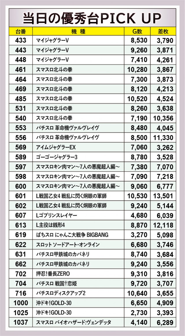当日は『スマスロ北斗の拳』540番台+10,356枚・『パチスロ 革命機ヴァルヴレイヴ』556番台+11,330枚・『L戦国乙女4 戦乱に閃く炯眼の軍師』601番台+13,501枚・『L主役は銭形4』613番台+12,118枚と、4台の万枚OVERが発生。本企画の初陣とは思えない大きな盛り上がりを披露し、ファンは至福の時間を過ごせたことだろう。また回転数の多さも目立っており、多くが大きな手応えを手にした様子も窺えるばかりだ。