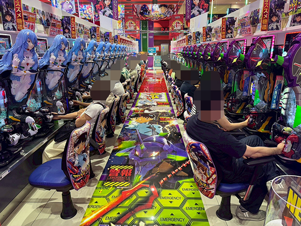 午後の4円パチンコの様子を見ると「新世紀エヴァンゲリオン〜未来への咆哮〜」や「ぱちんこ シン・エヴァンゲリオン Type レイ」、「P大海物語5」が大盛り上がり。機種性能を存分に発揮するプレイヤーを目の当たりにしている。