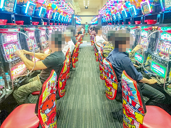 取材時の店内には多くのプレイヤーが来店。パチンコ・パチスロ共に、様々な機種が支持を集めていた。