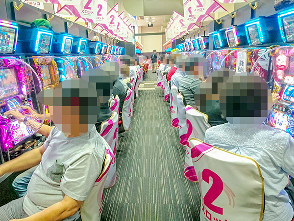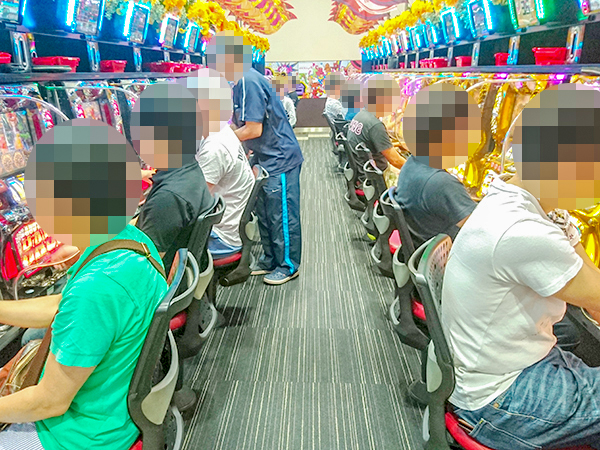 2円パチスロの支持も厚く、空き台が見当たらないほどの盛況ぶり。あちこちでプレイヤーの笑顔が見られ、シマ全体が明るい雰囲気に包まれていた。