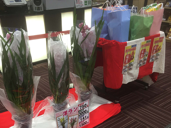 賞品コーナーには日用品やお酒など、アイテムが充実。この日は大きな観葉植物や福袋なども用意されていた。