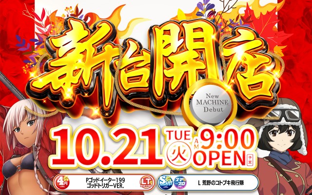 🎉本日21日は10月新台開店 第二弾!全館AM9時OPEN♬
