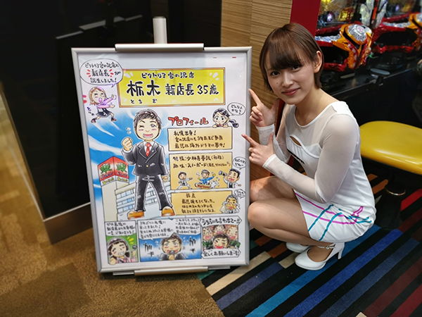 店長さんを紹介する手書きの看板を発見!! かわいらしいイラストも注目をしたポイントでっす(=゚ω゚)ノ