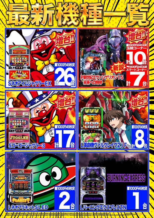 [1000円245玉] パチ:360台 [1000円980玉] パチ:160台 [1000円49枚] スロ:280台 |