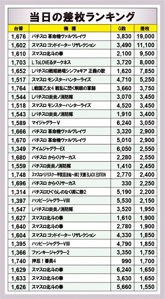 前述したように、『パチスロ 革命機ヴァルヴレイヴ』や『スマスロ北斗の拳』などスマスロ人気機種たちがしっかりとポテンシャルを解放していた様子が窺える。また『ファンキージャグラー2』も好成績をマークしており、各所で打ちごたえのある状況が整っていたことから、ファンは有意義な時間を過ごせたに違いない。
