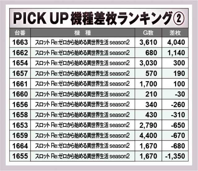 『スマスロ北斗の拳』から3,000枚OVERが5台発生しており、熱気を店内中へと伝播させていたのが印象的だ。『スロット Re:ゼロから始める異世界生活 season2』も4,000枚OVERの熱量が見られ、ポテンシャルを解き放っていた様子である。対して『スマスロモンキーターンV』の熱量は寂しさを感じるものの、回転数から可能性を感じ取っていた様子が窺え、いずれも館内の盛り上がりに貢献していたようだ。