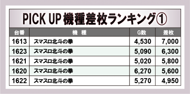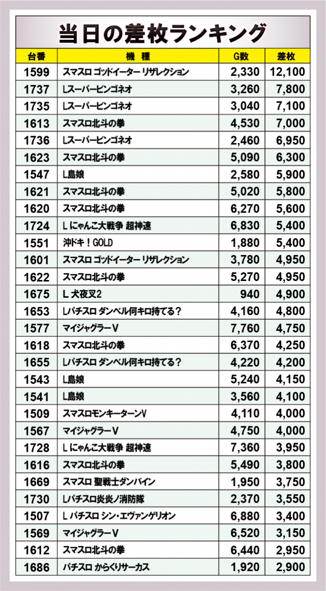 『スマスロ ゴッドイーター リザレクション』が万枚OVERをマークするや否や、スマスロ人気機種『Lスーパービンゴネオ』『スマスロ北斗の拳』が複数台ランクイン!さらに『L島娘』『L にゃんこ大戦争 超神速』といった新台も早速名を連ねており、各所で熱気が充満していた。ほかにもまとまった出玉を確保する台が多く存在し、相当な手応えを感じていたファンが多かったと窺える。