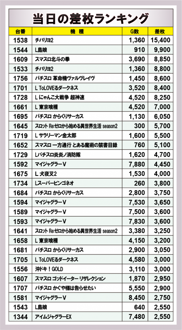 『チバリヨ2』から万枚OVERが発生。さらに『L島娘』から+9,900枚と追随するほか、スマスロ機を中心に大台突破台の多さにファンも歓喜したはずだ。さらに『マイジャグラーⅤ』や『アイムジャグラーEX』などノーマル機の活躍もみられ、あらゆる場所に可能性が眠っていたようだ。