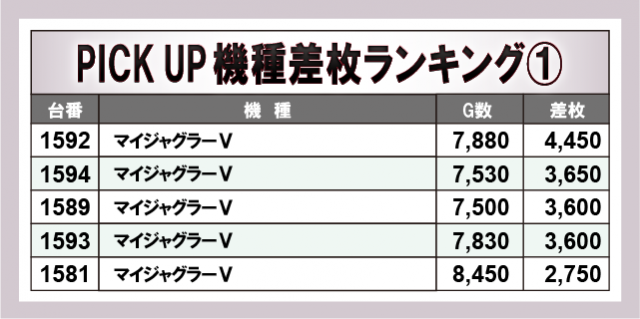 人気のスマスロ機を筆頭に叩きがいのある状況が整っており、4桁プラス台が多数発生!また『マイジャグラーⅤ』『アイムジャグラーEX』はじっくりと打ち込まれた形跡が顕著で、コンスタントに光るGOGOランプに魅了されていたことだろう。