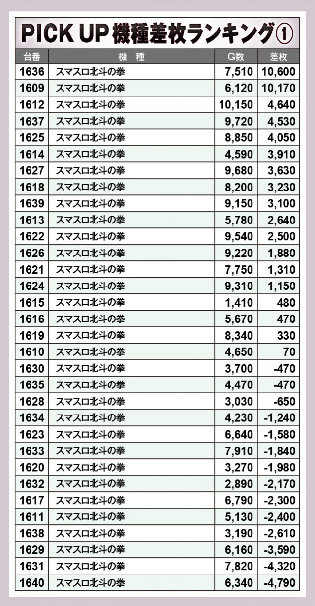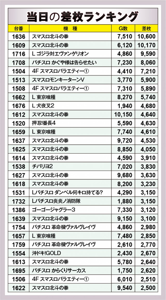 『スマスロ北斗の拳』にて2台の万枚OVERが発生し、当日の店内の盛り上がりを大きく牽引。さらに『L ゴジラ対エヴァンゲリオン』が9,500枚と大きな熱気を放ち、他にも大台突破台が目立つ内容となった。回転数に着目しても万回転OVERなど終日を通して打ち込まれた形跡を確認でき、遊技していたファンは確かな手応えを感じては、勢いよくレバーを叩いていたに違いない。