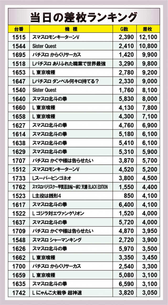 ※差枚数順に掲載しています。