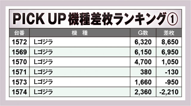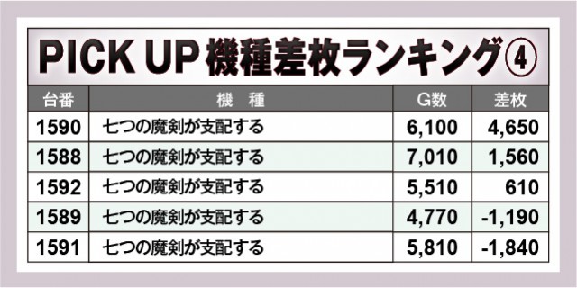 『Lゴジラ』『吉宗』から7~8,000枚OVERと大きな熱気が放たれ、館内の盛り上がりに大きく貢献していた。人気機種『スマスロモンキーターンV』も展開に恵まれなかった様子だが、それでも2台の6,000枚OVERを輩出するという気概を披露。『七つの魔剣が支配する』も半数以上でプラス差枚数を達成しており、これら優秀機種が大きな存在感を放っていたのは言うまでもないだろう。