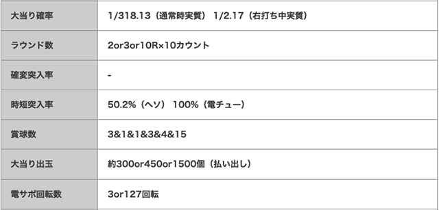 10R大当りは出玉約1500個(払い出し)を獲得できるうえに、実質連チャン濃厚の時短127回転が付く。