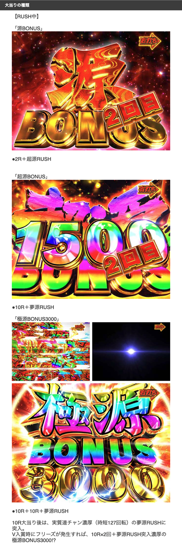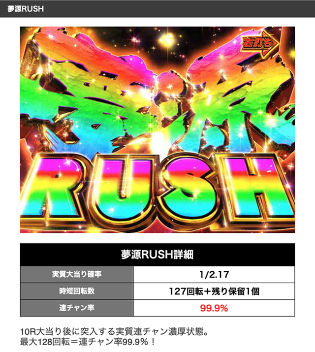 2つの連チャンゾーンがあり、最大4回転の超源RUSHと最大128回転の夢源RUSHをあわせたトータル継続率は約93%となっている。
