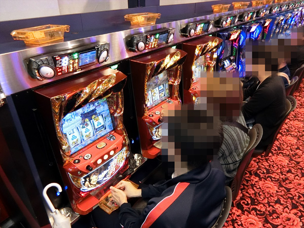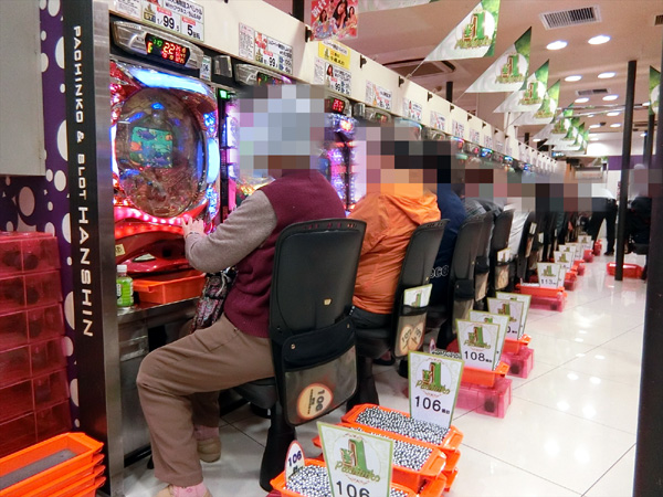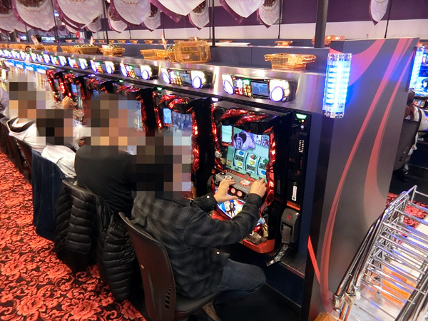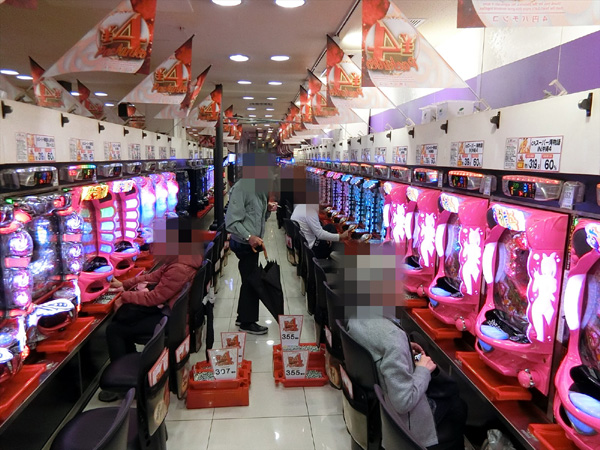 4円パチンコでは、海物語シリーズが人気。シマ全体が明るい雰囲気に包まれており、充実した時間が過ごせていたように見受けられた。