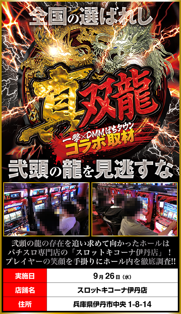 今回、「真双龍」をおこなった場所は、阪急電鉄・伊丹駅から徒歩圏内に位置する「スロットキコーナ伊丹店」。