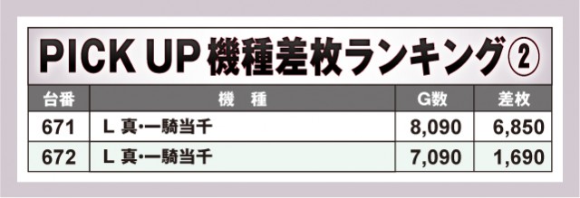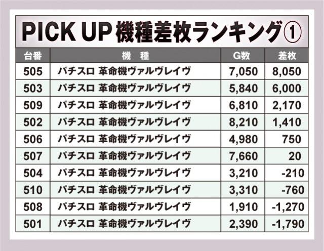『パチスロ 革命機ヴァルヴレイヴ』の505番台から8,050枚、『パチスロ かぐや様は告らせたい』の527番台から7,940枚、『Lパチスロ炎炎ノ消防隊』の566番台から7,690枚と、それぞれ申し分ない差枚数だ。