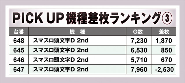 『パチスロ 革命機ヴァルヴレイヴ』『L 真・一騎当千』『スマスロ頭文字D 2nd』の全台データを差枚数順で掲載している。どの台がどれくらいの差枚数だったのかを確認しておこう。